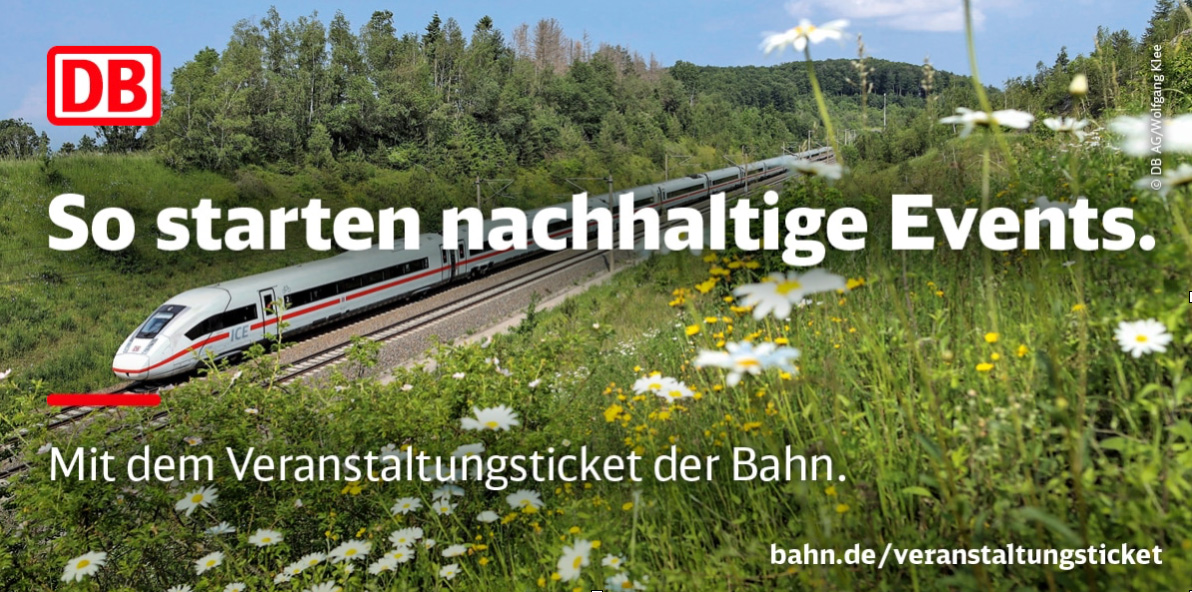 Entspannt ankommen – CO2-frei reisen. Ihr Veranstaltungsticket zum bundesweiten Festpreis. Von jedem DB-Bahnhof zu unserem Event und City-Ticket inklusive.